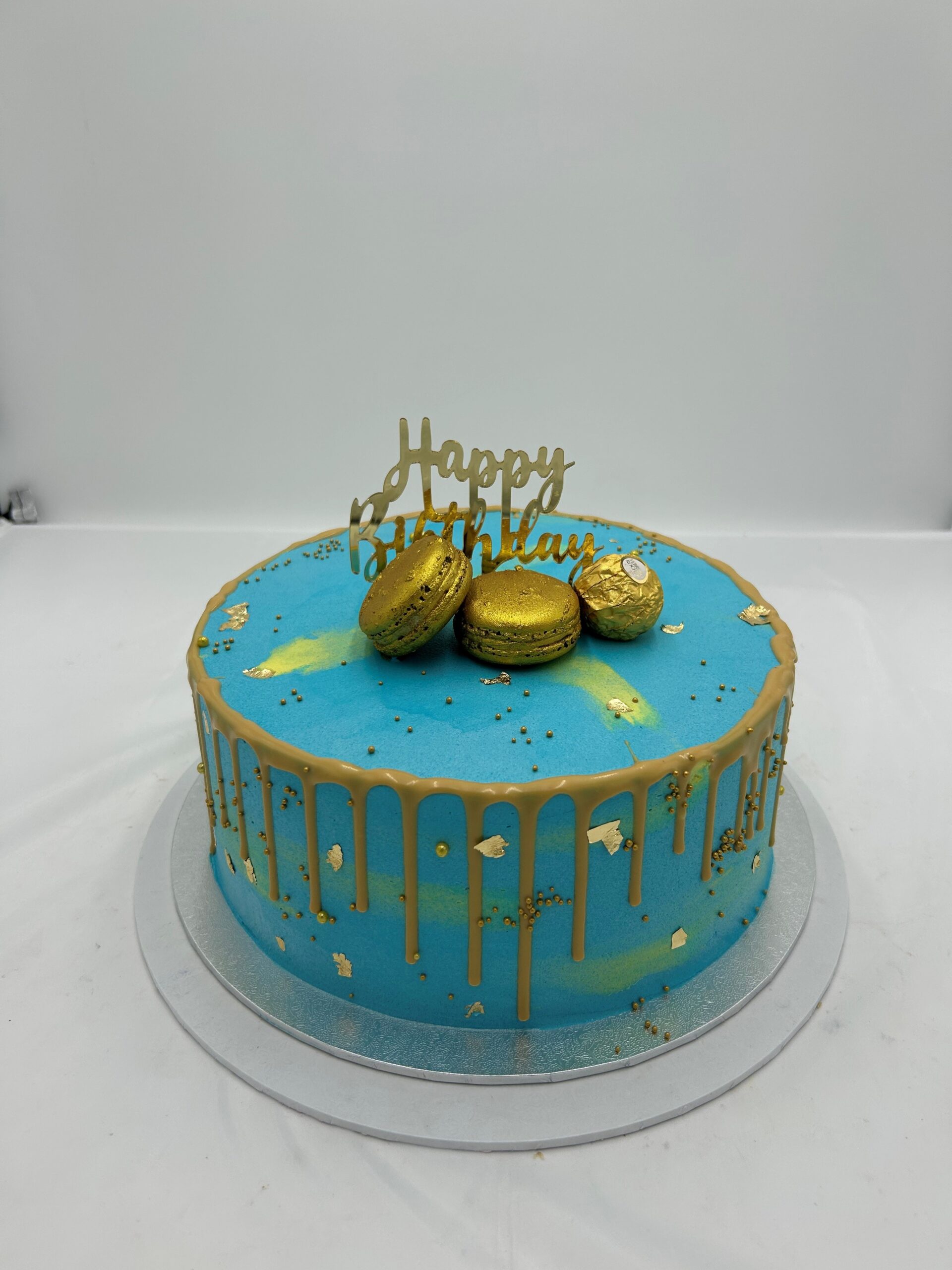 9”4layers vanilla sponge with fresh cream, gold pearls & gold drip